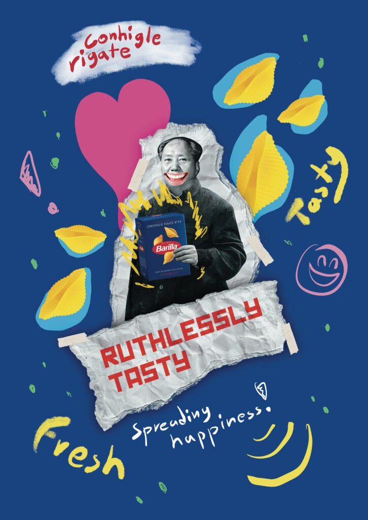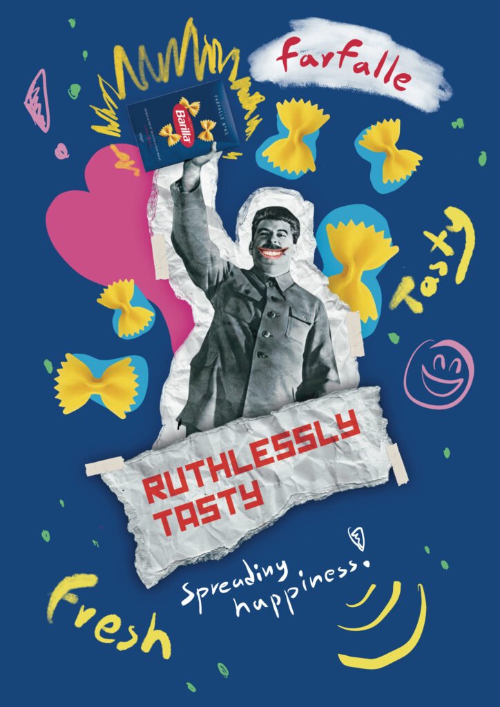 The Ruthlessly Tasty series brings forward a paradoxical and provocative image: iconic figures of power—often strict, controversial, or historically charged—posing proudly while holding a box of pasta. The visual language of fast food collides with the aesthetics of propaganda, creating something both familiar and unsettling. Exaggerated smiles, vibrant colors, and playful slogans form an ironic contrast between the seemingly innocent and the historically heavy.